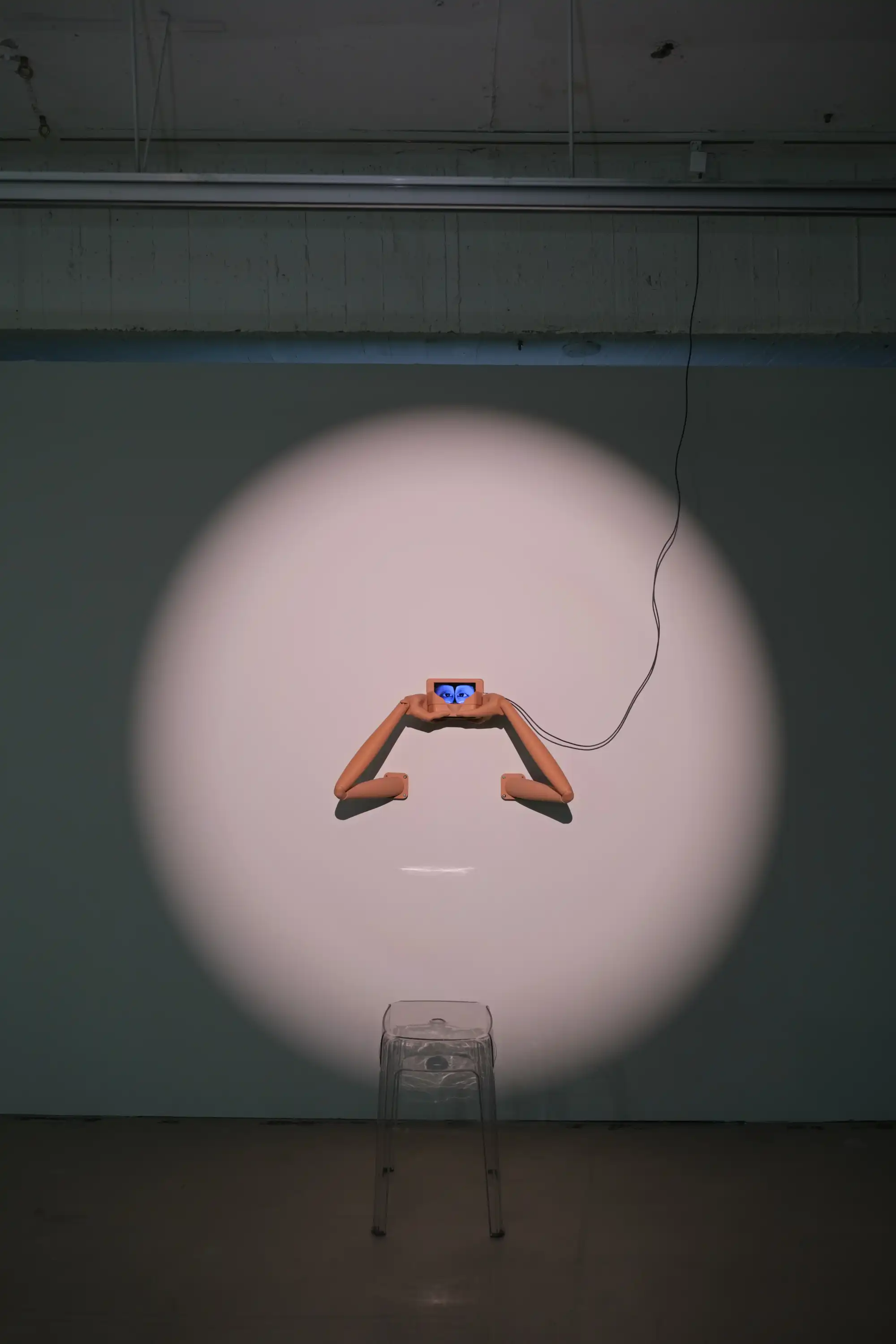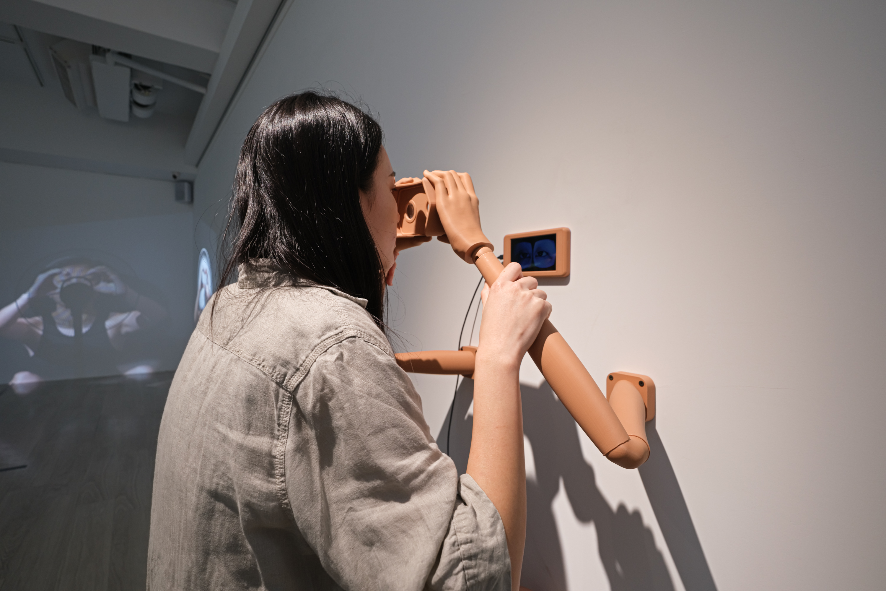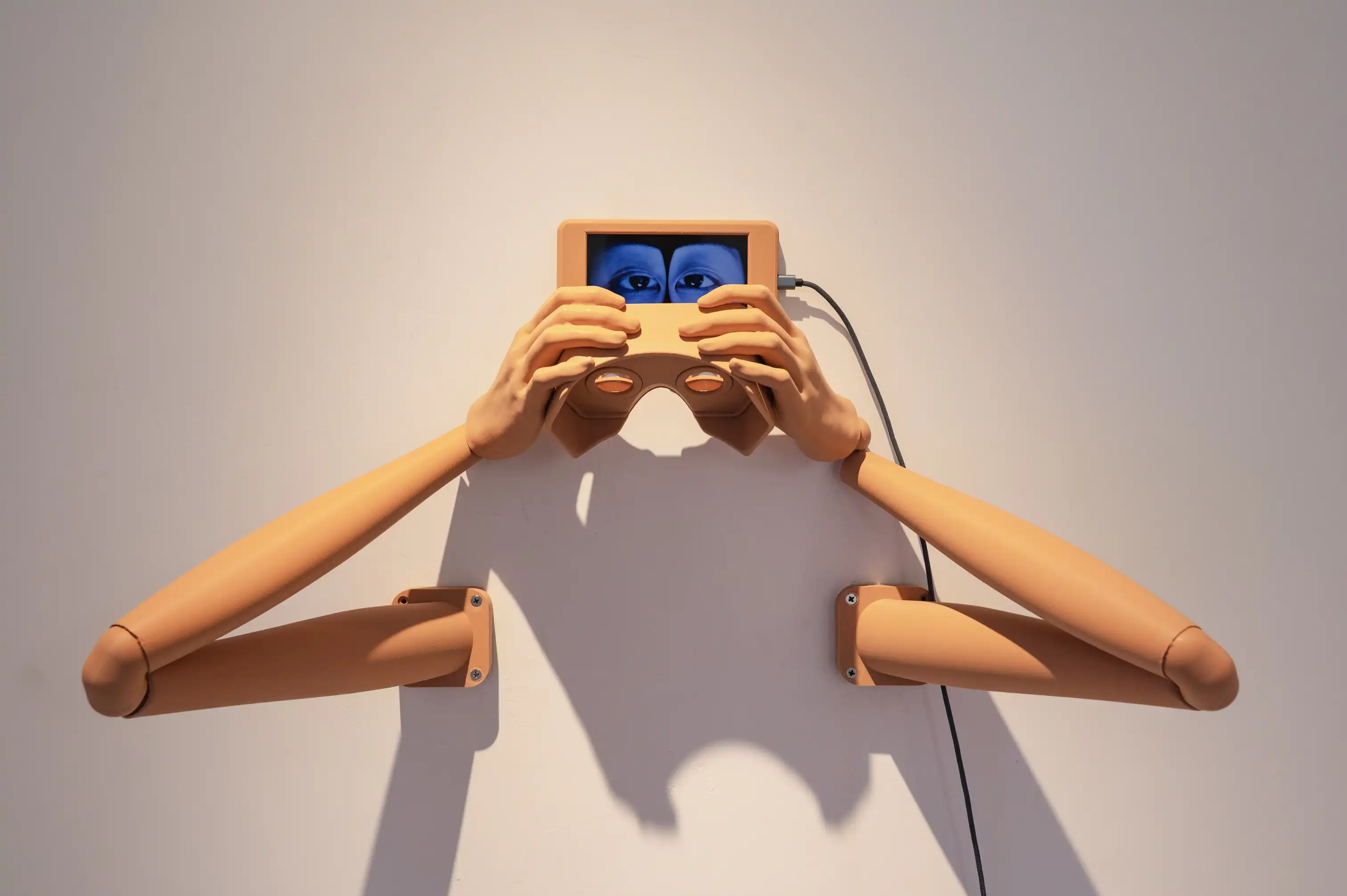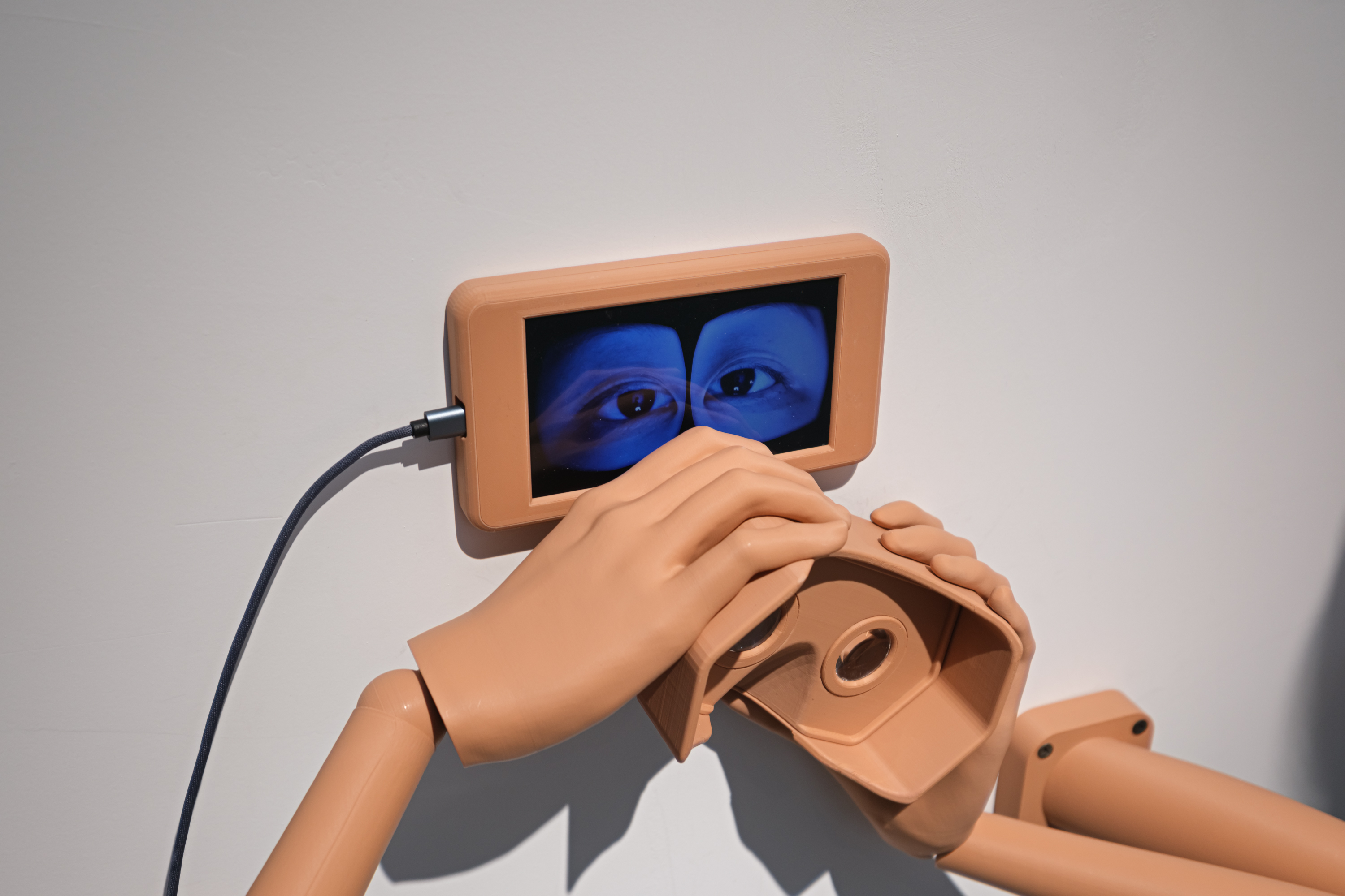 The screen displays an image of a pair of eyes, and the viewer can sit down, grasp these robotic arms, and engage in mutual gazing with them. Unlike before, through the VR glasses held by the arms, the viewer will see a synthetic eye formed by the overlapping of both eyes, rather than a representation of either eye as it appears in reality.