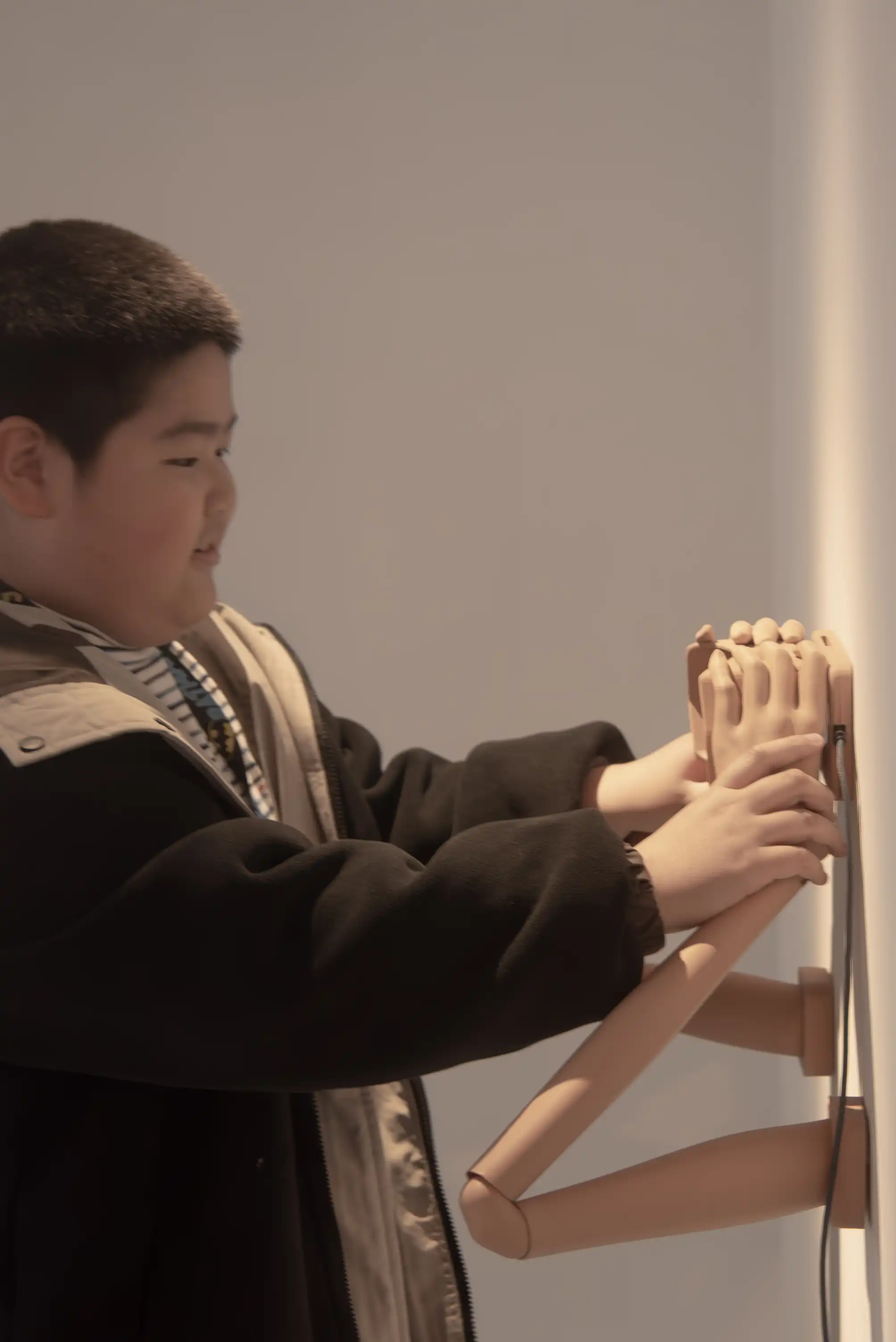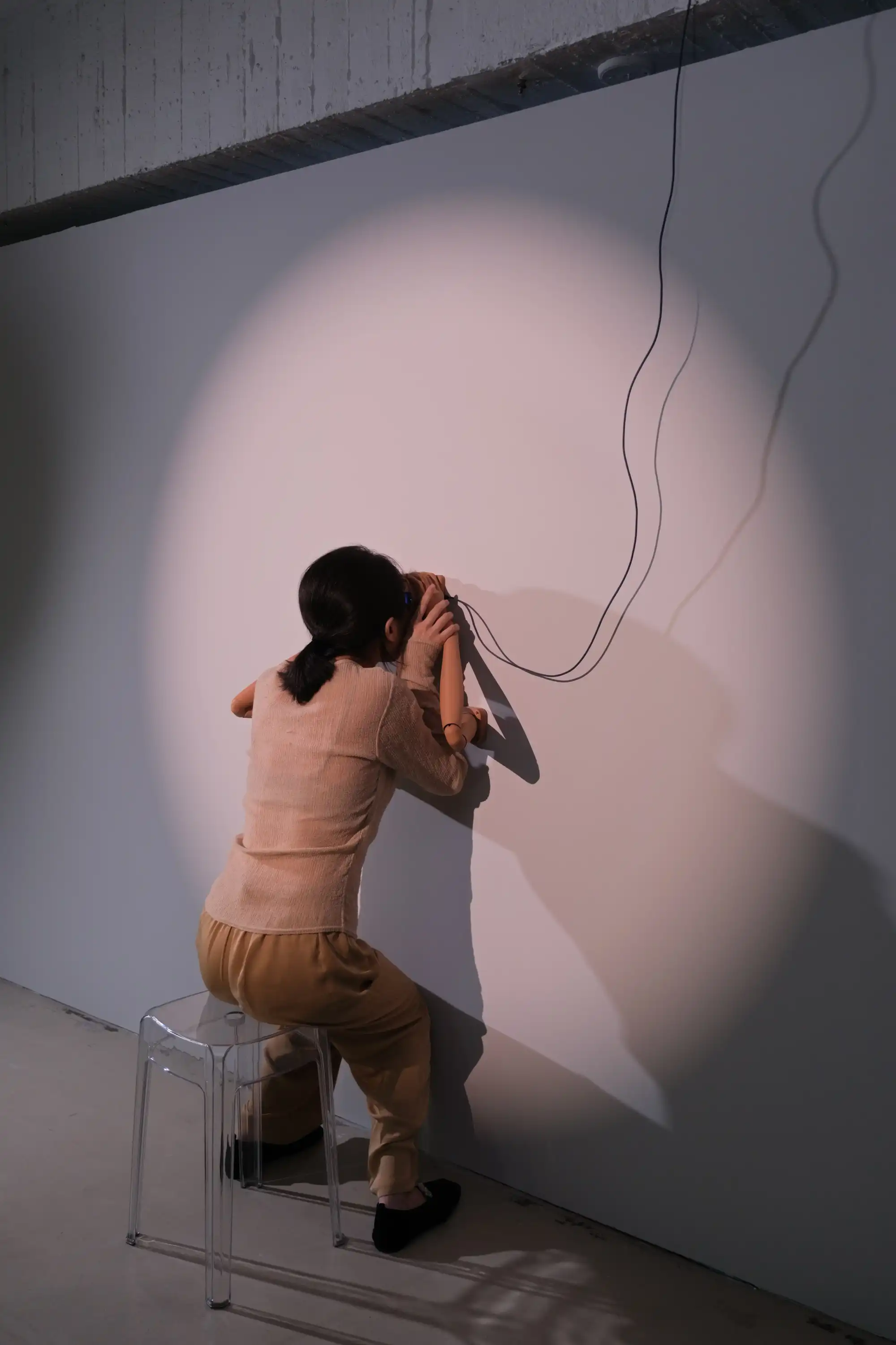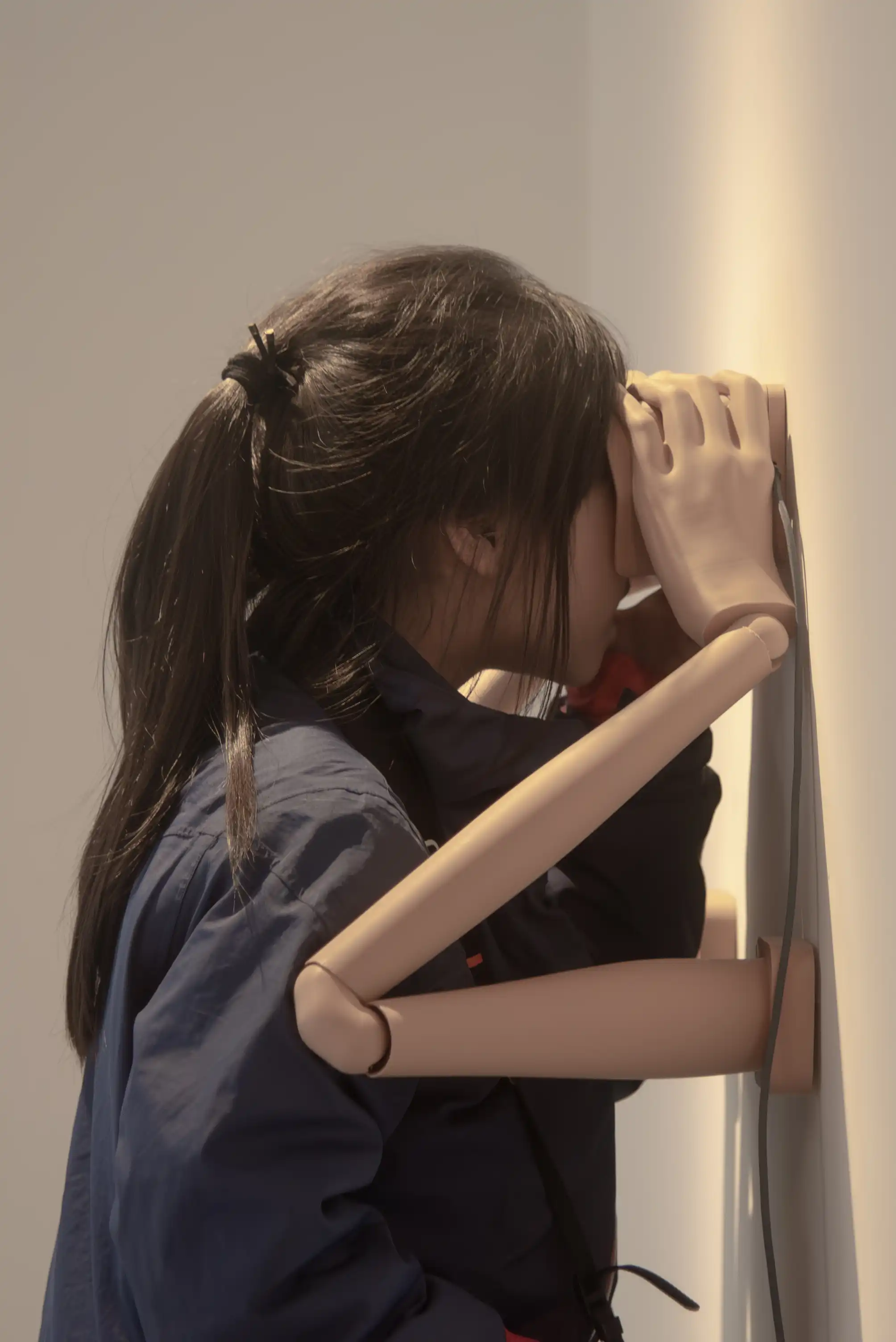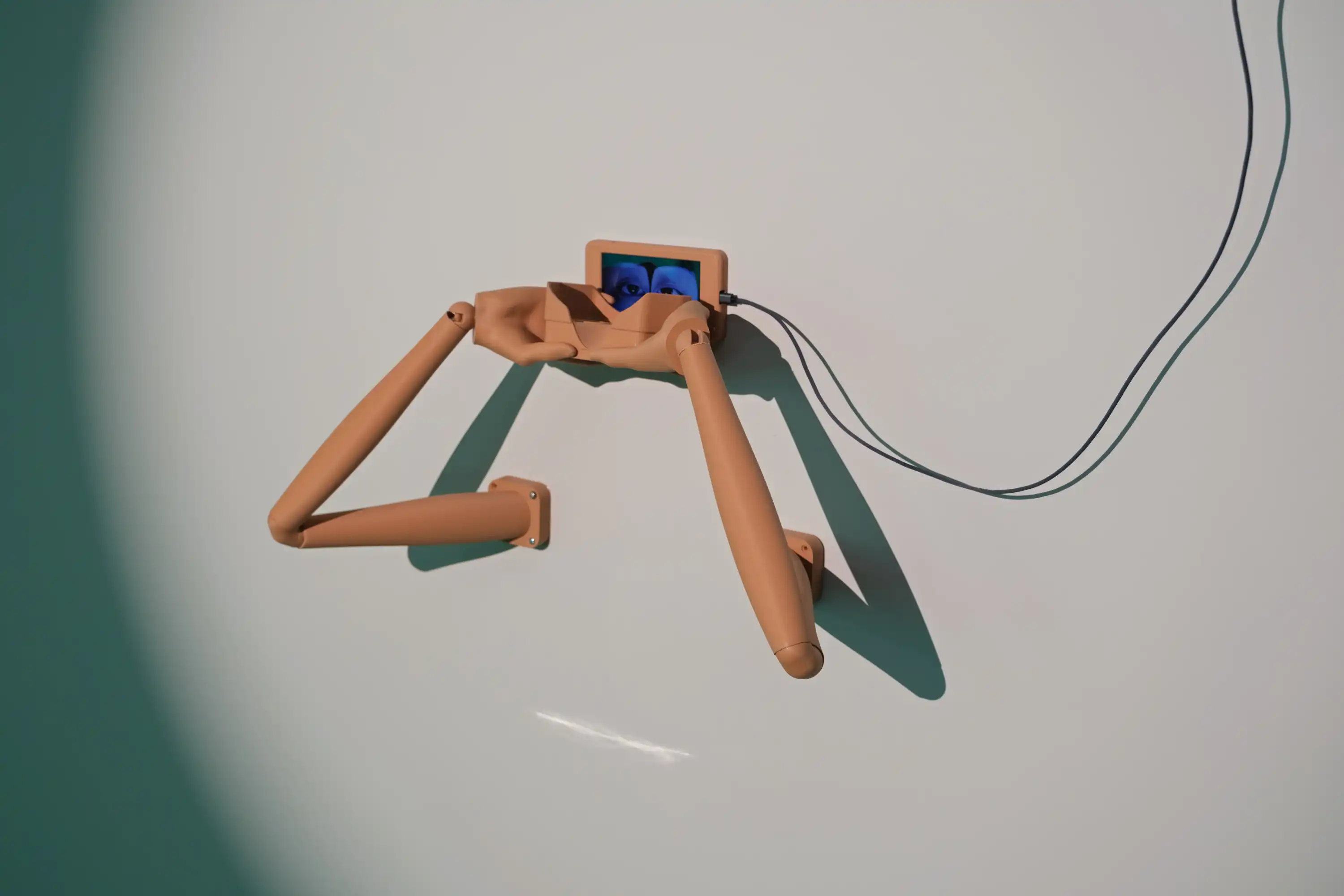 The screen displays an image of a pair of eyes, and the viewer can sit down, grasp these robotic arms, and engage in mutual gazing with them. Unlike before, through the VR glasses held by the arms, the viewer will see a synthetic eye formed by the overlapping of both eyes, rather than a representation of either eye as it appears in reality.