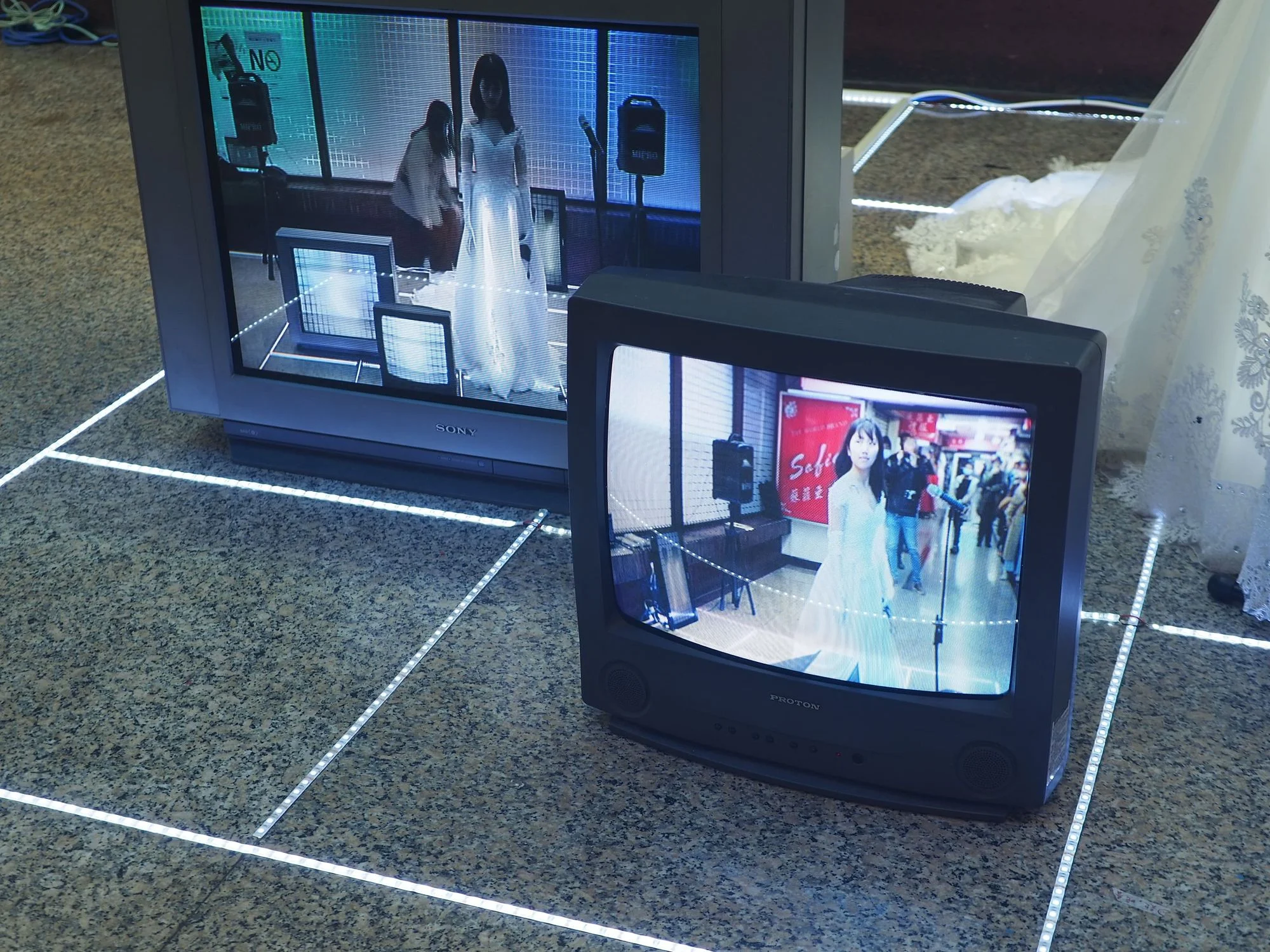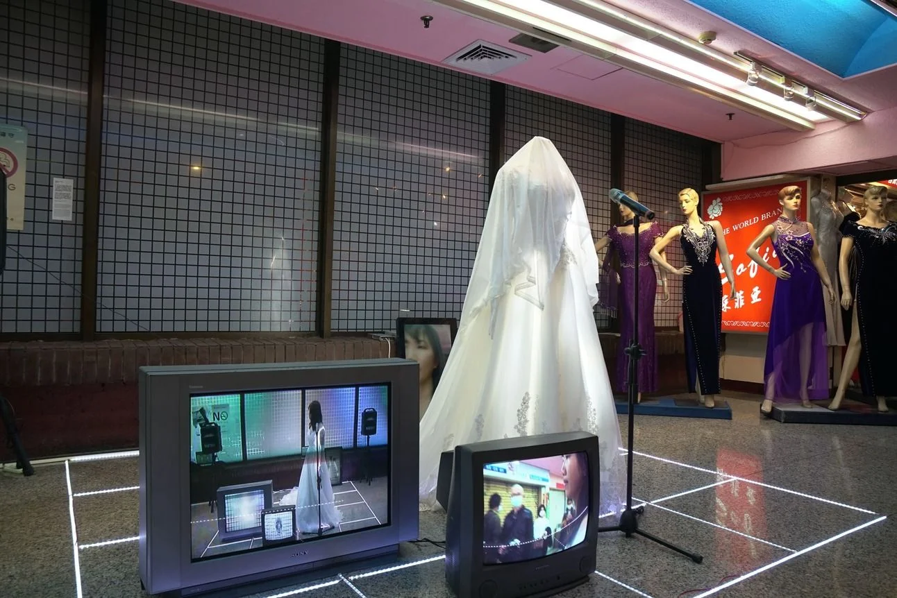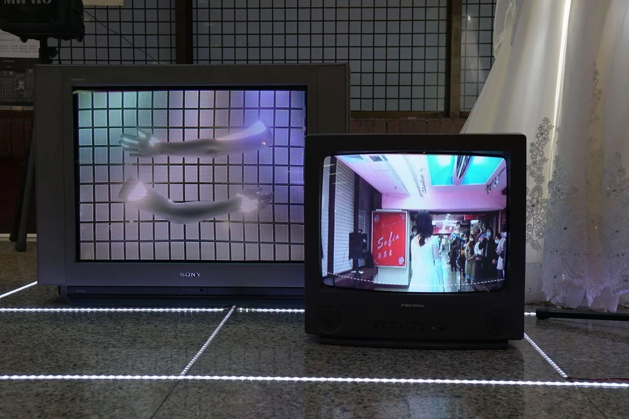 In this site-specific work, I wandered through the building wearing a wedding dress, scanning parts of my body into 3D models. I constructed an LED-framed luminous stage next to a dress shop and performed using recordings collected on-site and electronic music. I hoped to virtualize my body, turning it into an entity akin to the mannequins in the dress shop.
