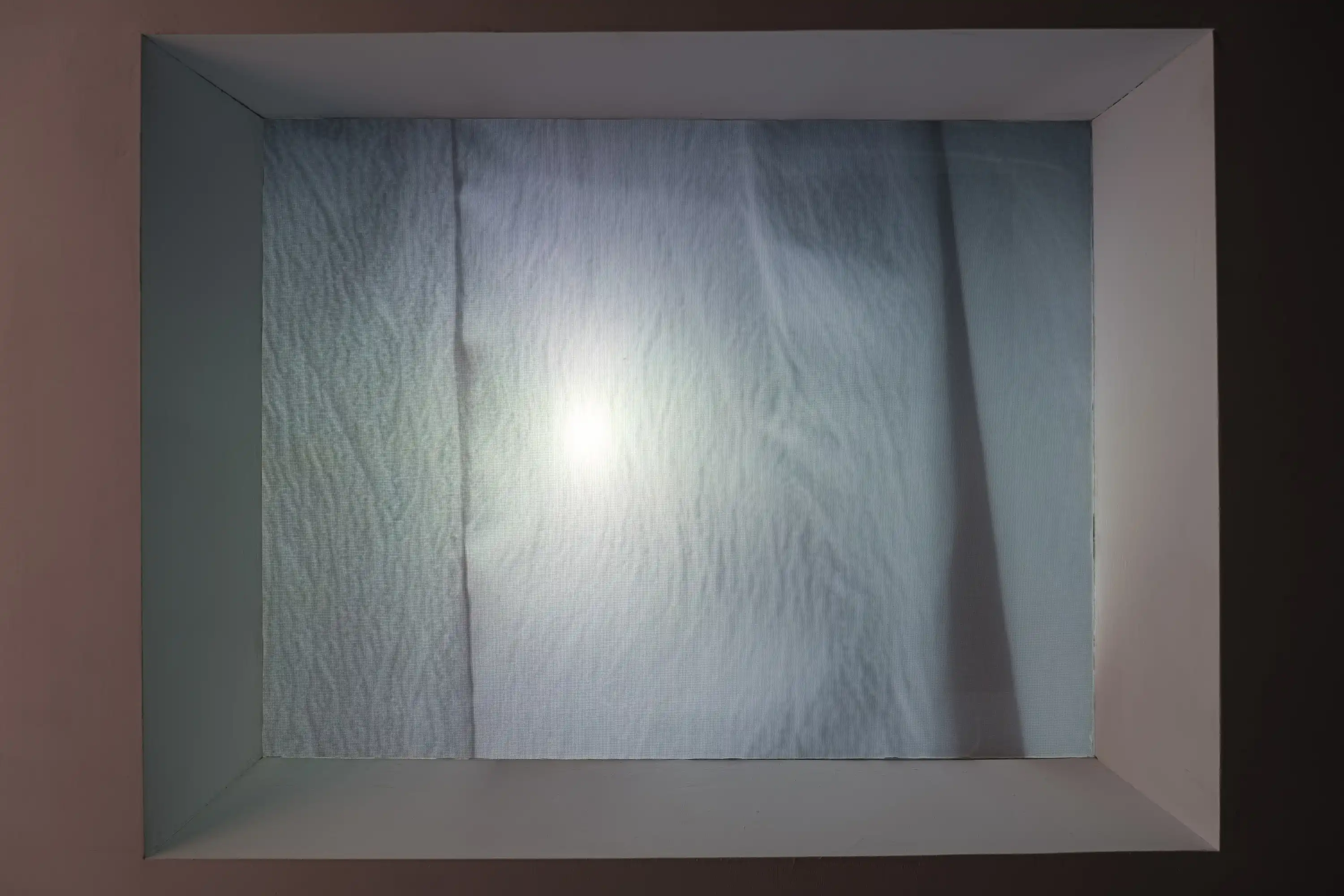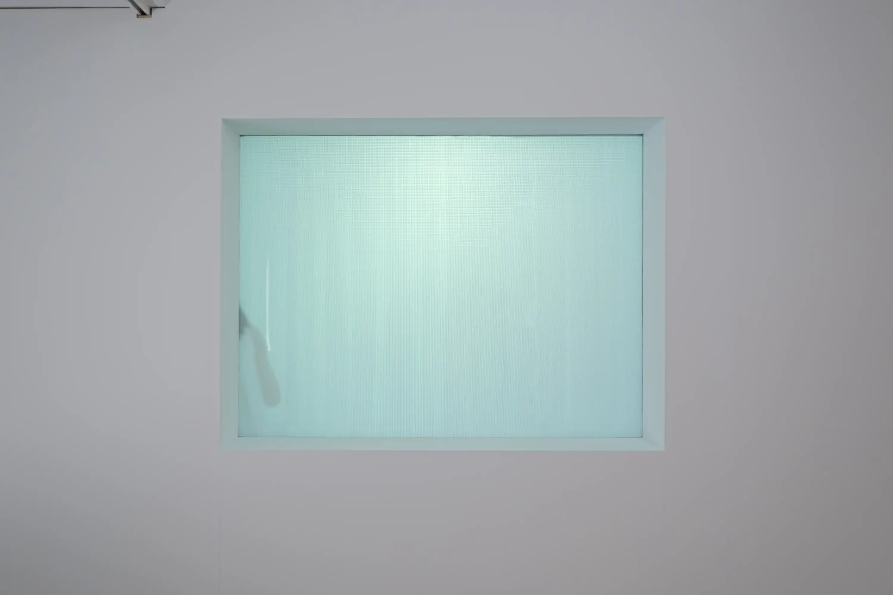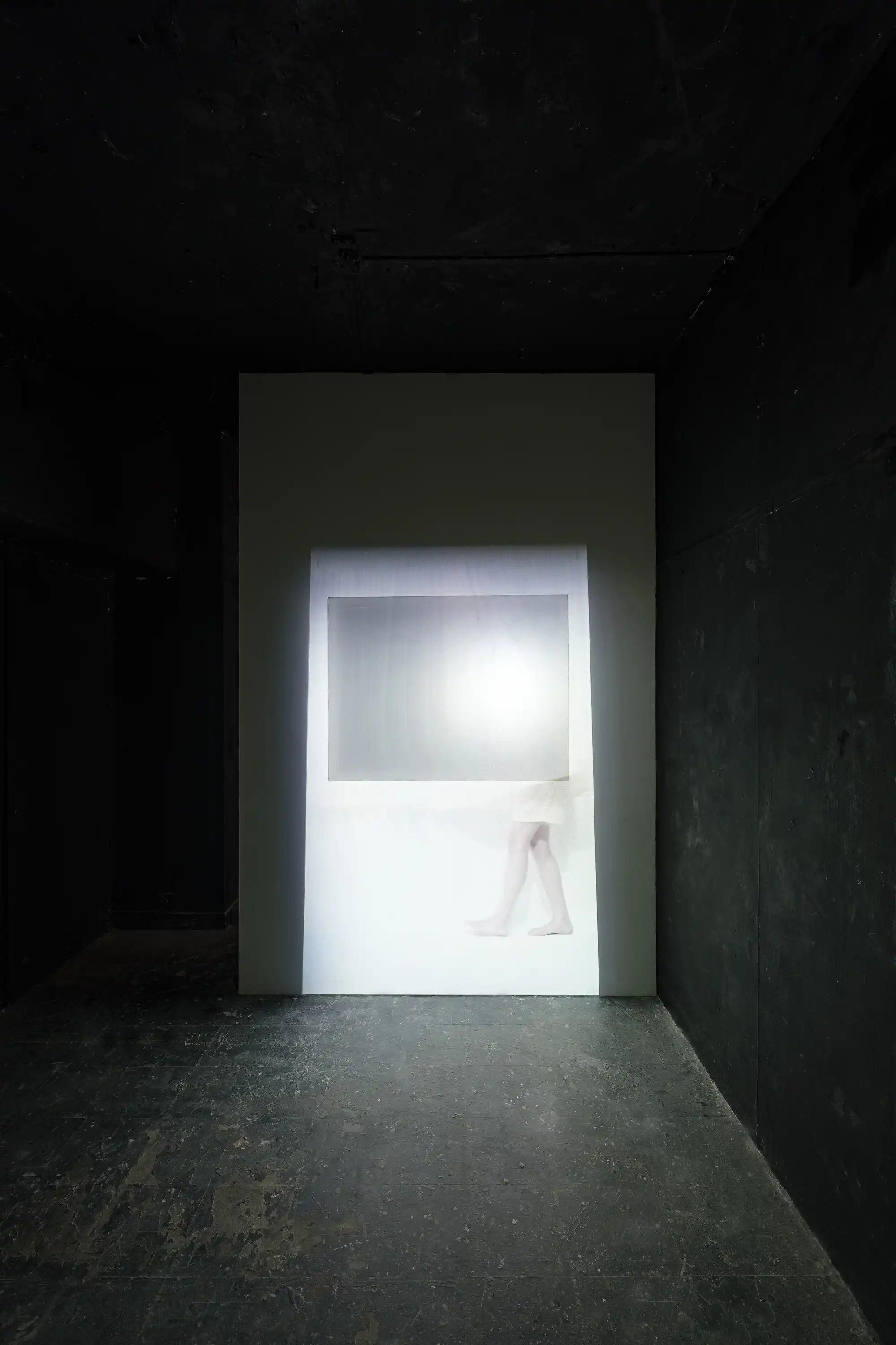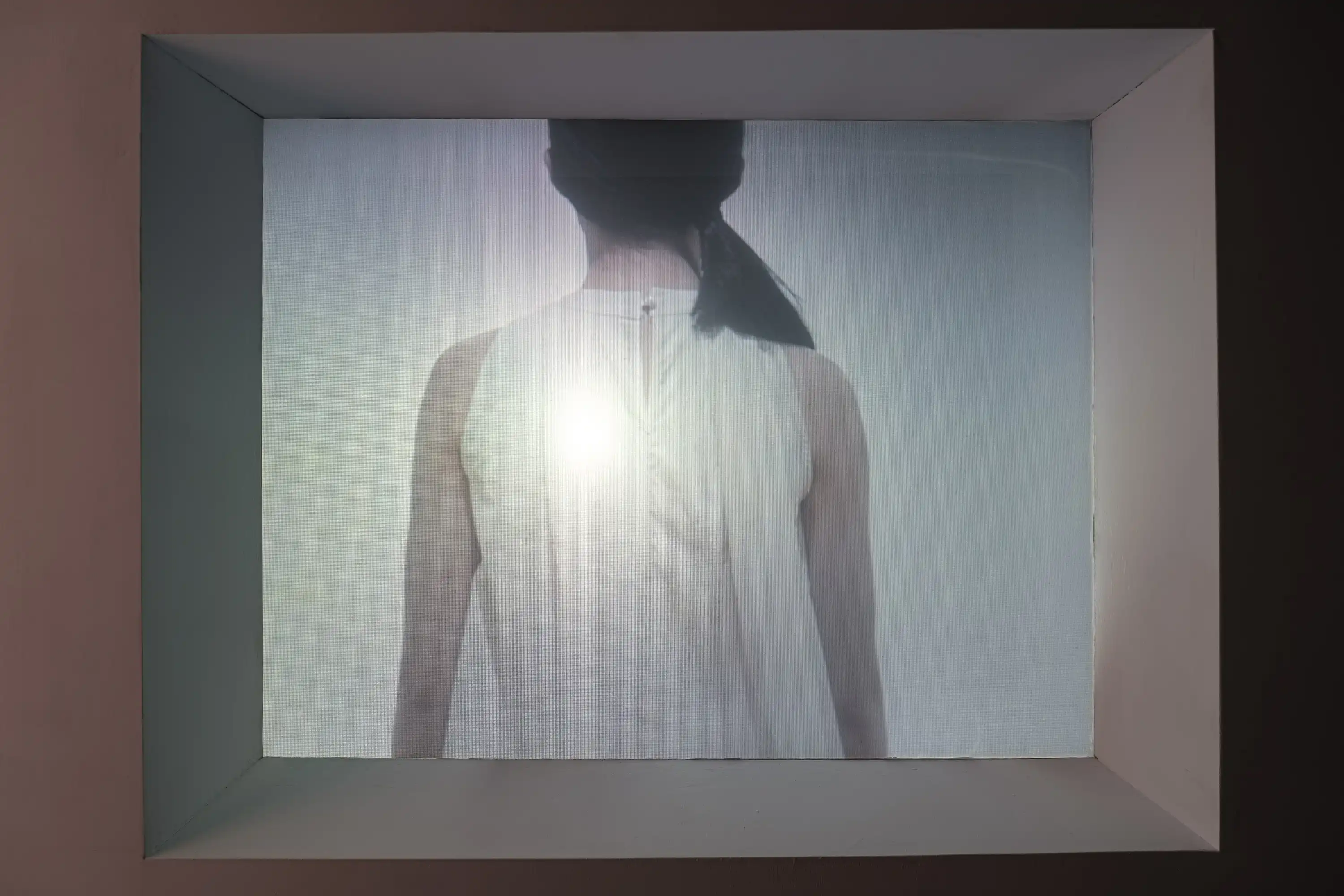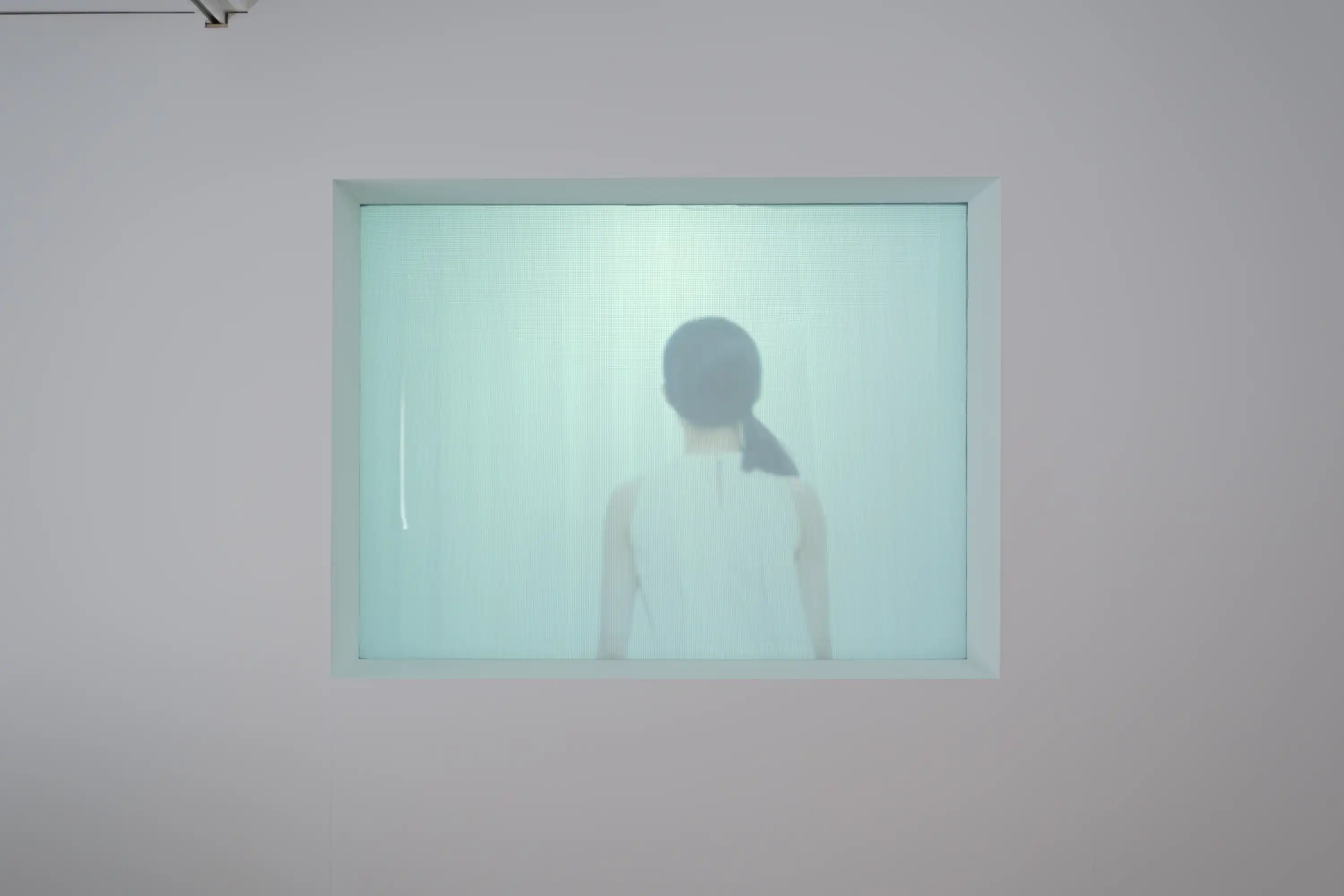 She becomes a two-faced or two-backed person, simultaneously inside the window and outside; when disappearing behind the curtain, she is neither inside nor outside. Through imagination, her body’s position forms a concave negative space: within the “thickness” of the image, a “nowhere,” a place that doesn’t exist.